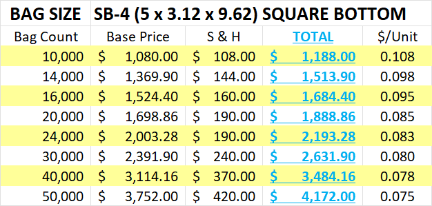 Our SB-2 Square Bottom Prescription Bags are a popular choice for pharmacies and are perfect for small prescription fills. Bags measure 9.62 inches tall and 5 inches wide and open with a 3.12 inch gusset. Bags can be printed in up to 4 colors of ink. Three and four color printing requires a minimum order of 14,000 bags. Price below includes up to 2 stock ink colors.